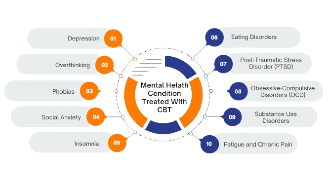 As I mentioned above, CBT can be used for treating various mental health conditions. It starts by recognizing harmful thinking patterns, challenging them, and replacing them with more constructive ideas. Below is the list of mental health problems that CBT can fix: